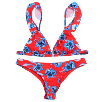Features: Plunge neck and backless style present a sexy feel. Padded cups improve the breast shape. Flounce and floral print expose your feminine charm. Low waist bikini bottom shows the waistline.
