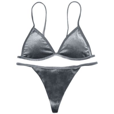 Spaghetti Strap Padded Backless Low Waist Velour Women Bikini Set (LIGHT SLATE GRAY)