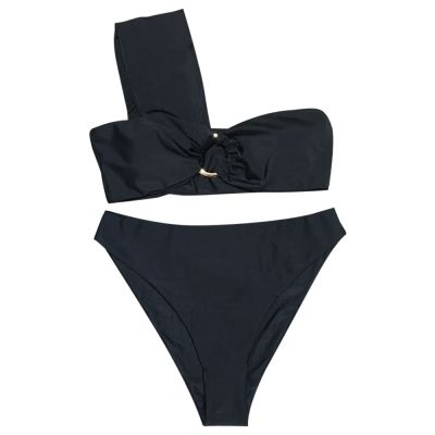 One Shoulder Padded Solid Color High Waist Women Bikini Set (BLACK)