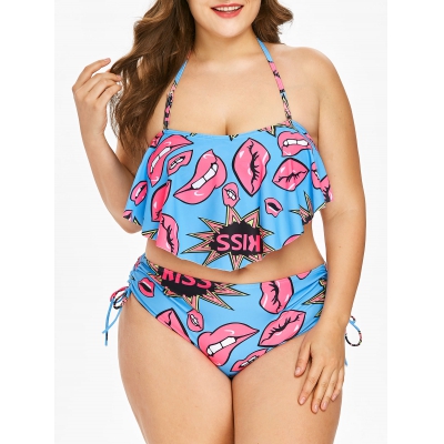 This novelty bikini set is a stylish swimming wardrobe must-have. A stretchy wireless bikini top enhances your natural shape while the bold lips graphic and flounce overlay makes it ideal to be eye-catching. Comfy self-tie back styling. Matching with high-waisted bottoms for perfect coverage.