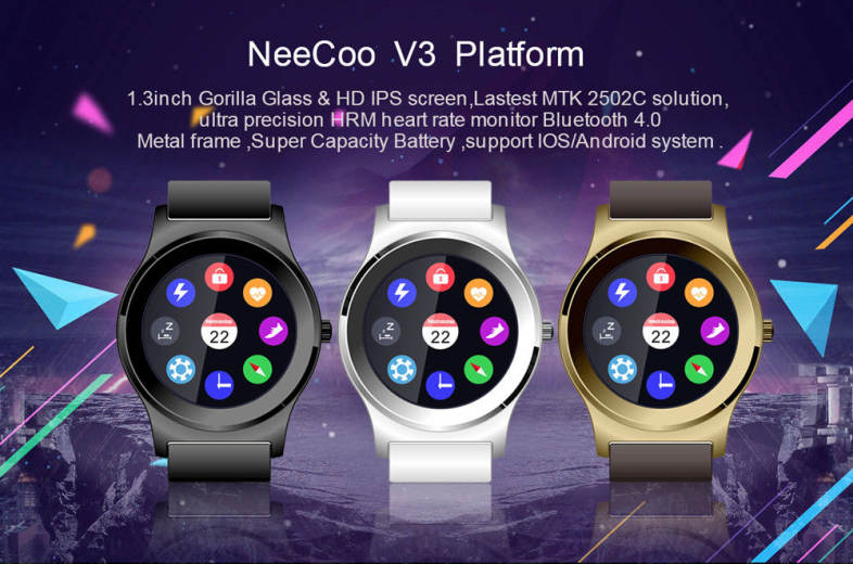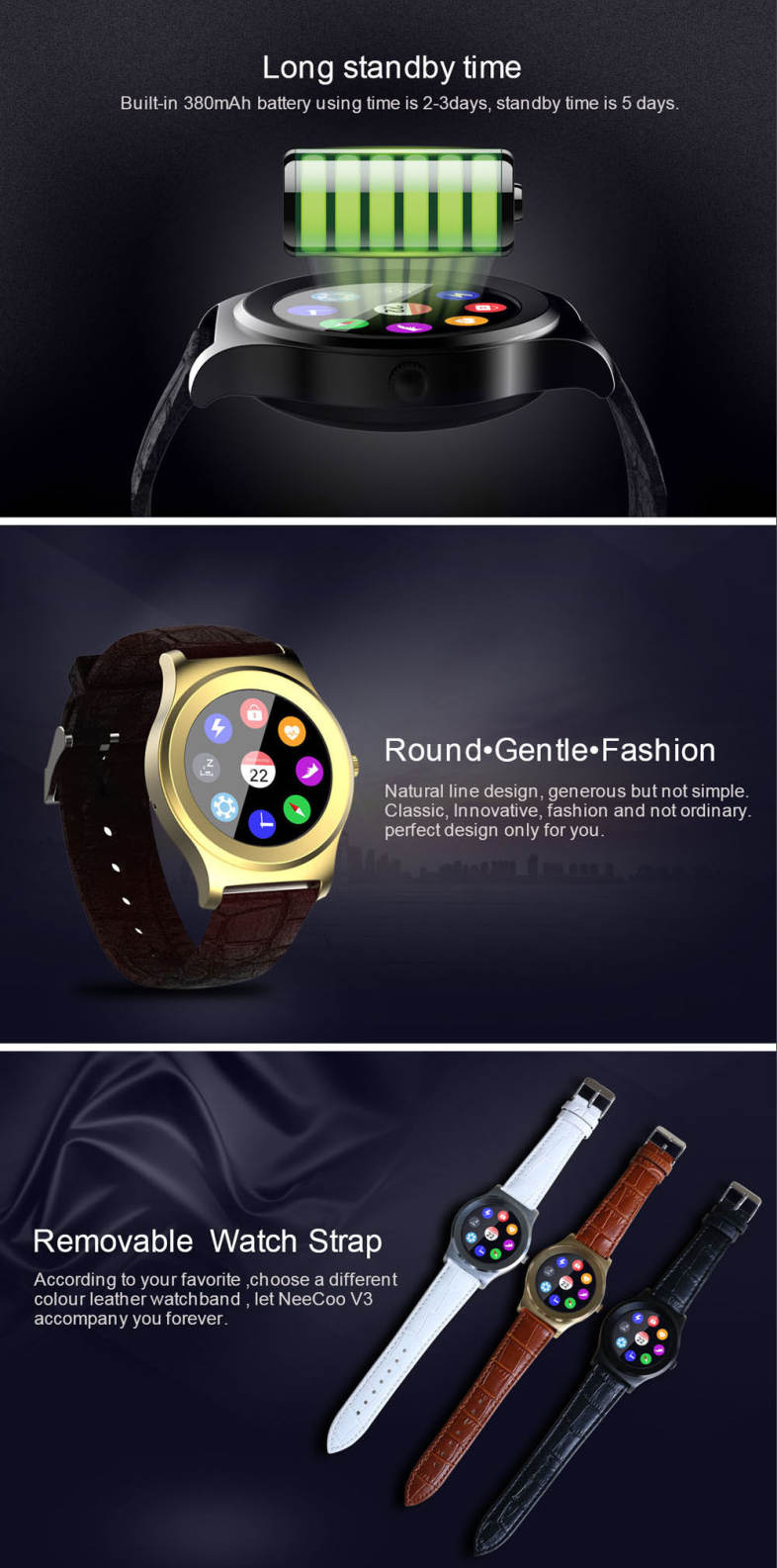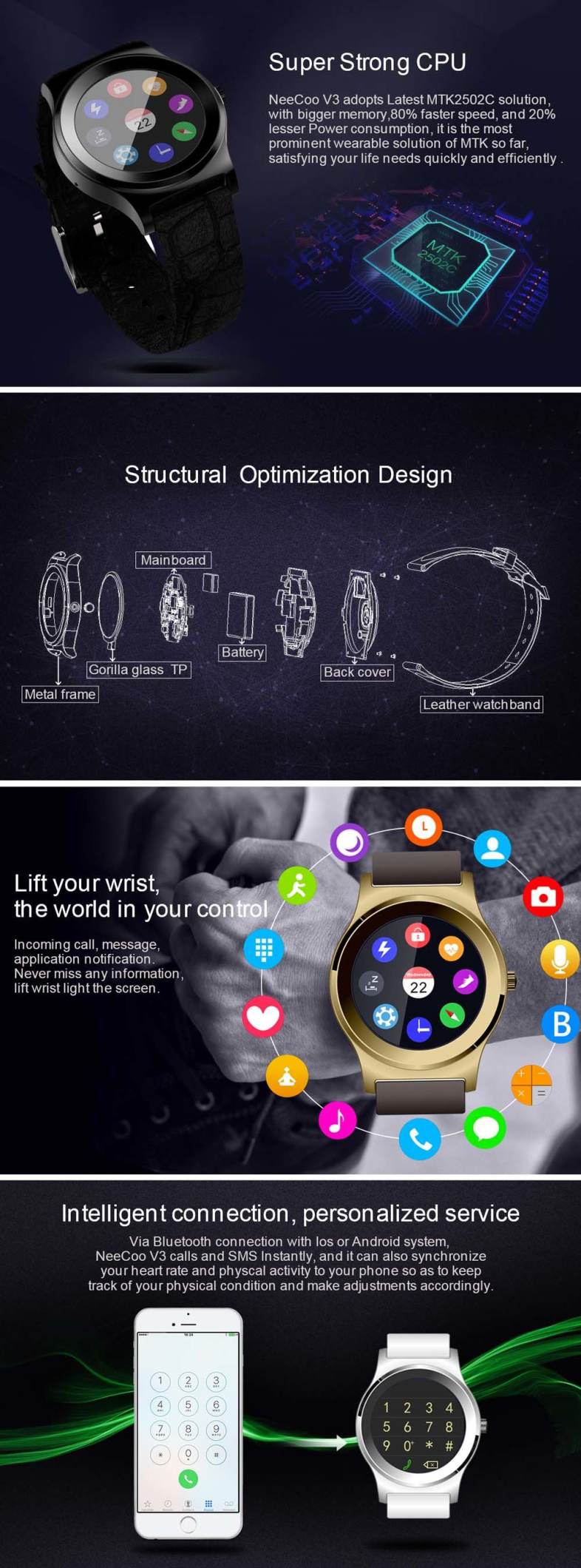 Main Features: - Heart rate monitor: with optical sensor, it can test and record your heart rate - Bluetooth 4.0: you can use it to listen to music and take photos, enjoy your leisure time - Sleeping track: record your sleep quality and sleep time, so you can adjust some habits to improve your sleeping condition - Lift your wrist, light the screen - High capacity 380mAh Lithium-ion polymer battery, with 2-3 days using time and 5 days stand-by time, durable to use - Removable strap, you can change a better one for it - Life water-resistant, you cannot wear it to swim, dive or shower Brand: NeeCoo Built-in chip type: MTK2502 Bluetooth version: Bluetooth 4.0 RAM: 64MB ROM: 128MB Bluetooth calling: Call log sync,Phone call reminder,Phonebook Messaging: Message reminder Health tracker: Heart rate monitor,Pedometer,Sedentary reminder,Sleep monitor Remote control function: Remote Camera,Remote music Notification: Yes Notification type: Facebook,Twitter,Wechat,WhatsApp Find phone: Yes Alert type: Ring,Vibration Locking screen : 6 Other function: Alarm,Calculator,Stopwatch,Voice recorder Screen: IPS Screen resolution: 240 x 240 Screen size: 1.3 inch Operating mode: Touch Screen Type of battery: Lithium-ion Polymer Battery Battery Capacty: 380mAh Charging time: About 60mins Standby time: About 5 Days People: Female table,Male table Shape of the dial: Round Case material: Alloy Band material: Silicone Compatible OS: Android,IOS Language: English,French,German,Japanese,Korean,Portuguese,Russian,Simplified Chinese,Spanish Available color: Black,Gold,Silver Dial size: 4.4 x 4.4 x 1.15 cm / 1.73 x 1.73 x 0.45 inches Band size: 26.2 x 2.2 cm / 10.31 x 0.87 inches Product size (L x W x H): 26.20 x 4.40 x 1.40 cm / 10.31 x 1.73 x 0.55 inches Package size (L x W x H): 10.00 x 10.00 x 7.50 cm / 3.94 x 3.94 x 2.95 inches Package weight: 0.229 kg Package Contents: 1 x NeeCoo V3 Smart Watch, 1 x USB Cable, 1 x Chinese and English Manual Warranty: 3 Months .jpg/c80)