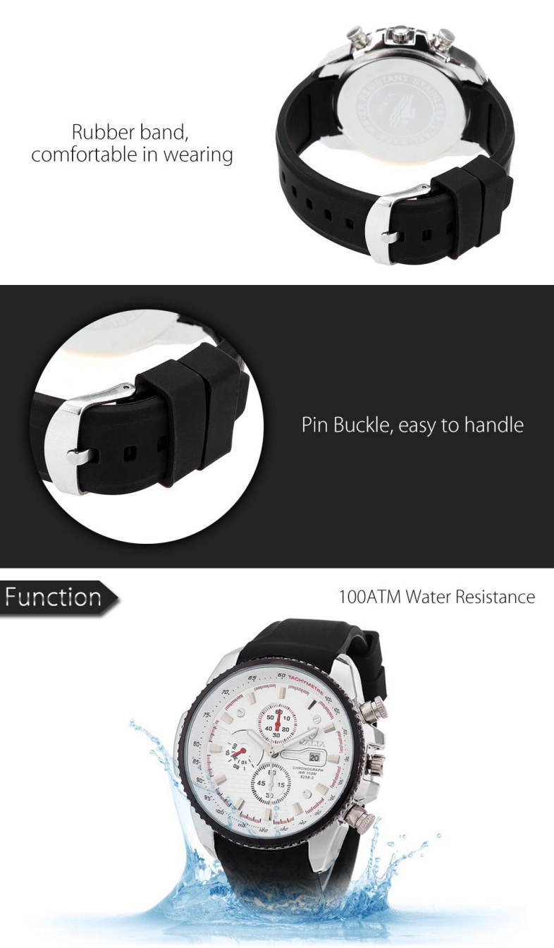 Main Features: • Trendy round case quartz wrist watch, designed specifically for business men. • Quartz movement guarantees precise and punctual time. • With date function. • Three non-functioning sub-dials. • Stainless steel case is sturdy in structure and uneasy to scrape. • Leather band is comfortable to wear. • Help you to always be on time. • Good time-reminder and ornament. Watches categories: Male table Watch style: Business Available color: Black,Brown,White Movement type: Quartz watch Shape of the dial: Round Display type: Analog Case material: Stainless Steel Band material: Leather Clasp type: Pin buckle Special features: Date,Decorating small sub-dials The dial thickness: 1.4 cm / 0.55 inches The dial diameter: 4.6 cm / 1.81 inches The band width: 2.2 cm / 0.87 inches Package weight: 0.079 kg Product size (L x W x H): 26.00 x 4.60 x 1.40 cm / 10.24 x 1.81 x 0.55 inches Package size (L x W x H): 27.00 x 5.60 x 2.40 cm / 10.63 x 2.2 x 0.94 inches Package Contents: 1 x Watch Warranty: 3 Months