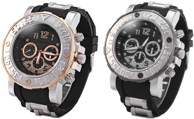 Men wrist quartz watch, elegant design Three non-functioning sub-dials for decoration The cycle ring on surface is rotatable ( only on counter-clockwise ) Guarantees precise and punctual timing Durable rubber band Pin buckle closure, convenient and easy to wear Life water resistant only ( don't put it into water dorectly ) Nice gift for friends