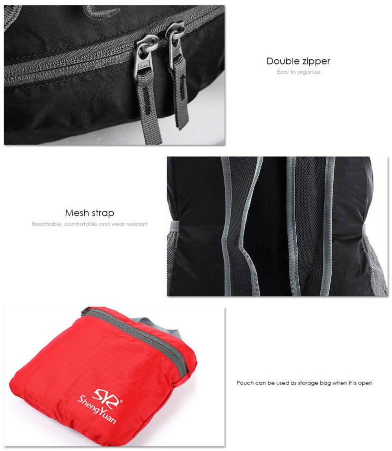 - Suitable for hiking, cycling, camping, traveling and other outdoor activities - Nylon material, water resistant, durable and anti-tear - Foldable and lightweight, easy to carry - Double zipper, easy to organize - Mesh belt, breathable, comfortable and wear resistant - Pouch can be used as storage bag when it is unfolded - Unfolded size: 18 x 27 x 43cm